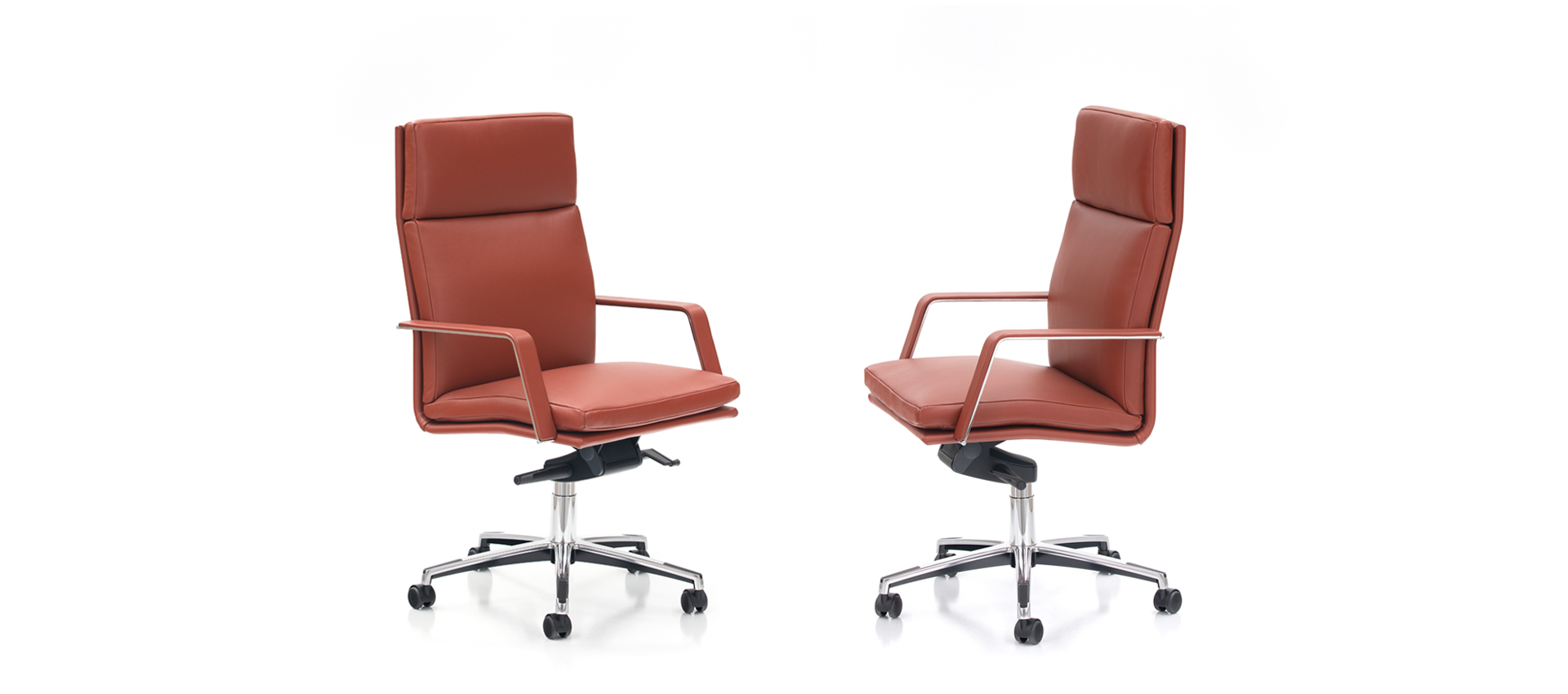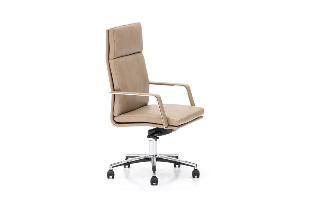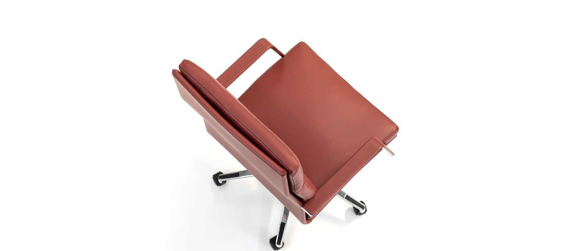 Swivelling and reclining armchair with frame and cushions in soft leather. Chromed arms, with upper part in leather. Base in polished or black lacquered aluminium.
