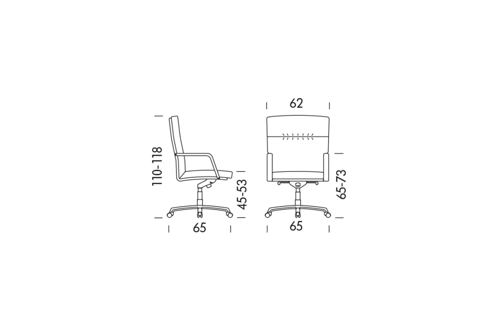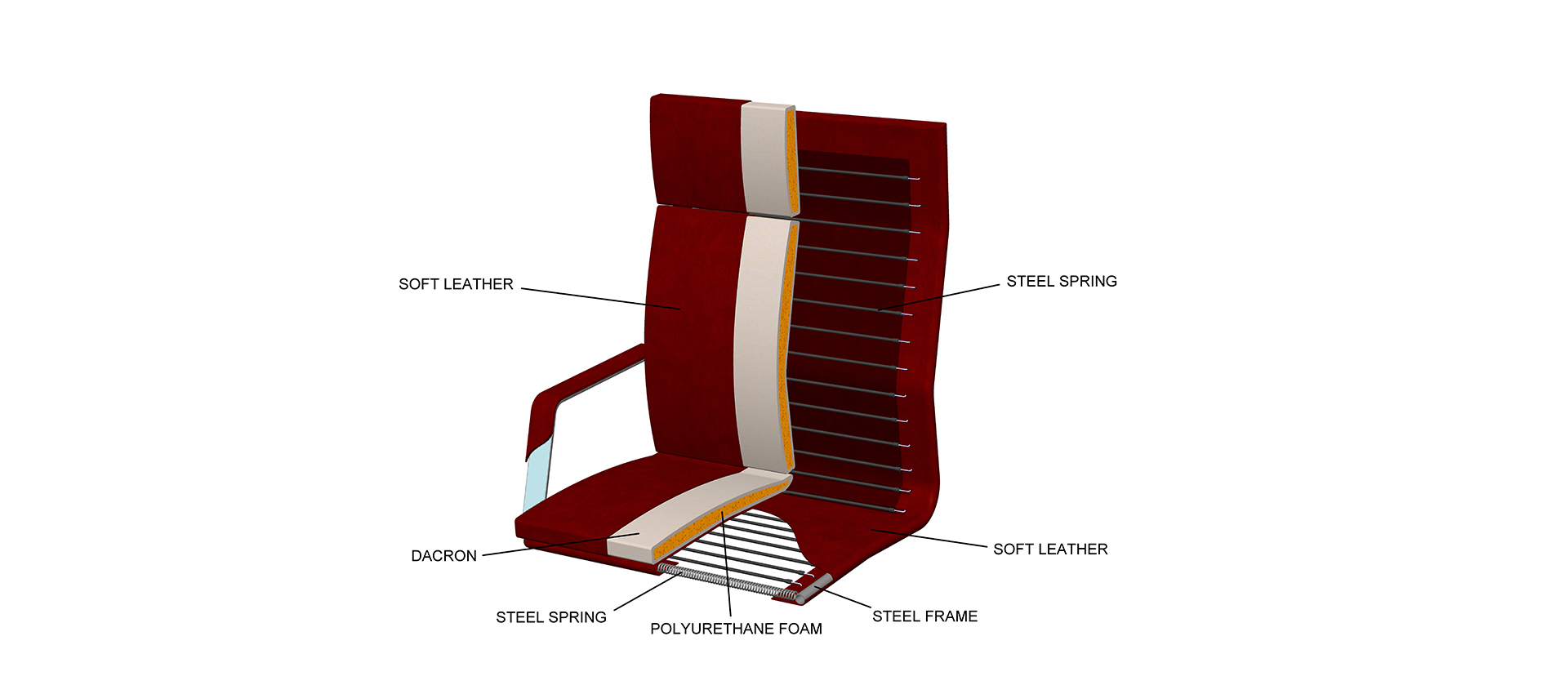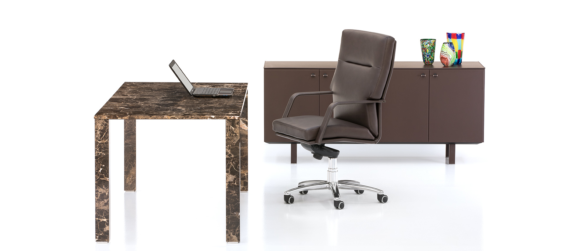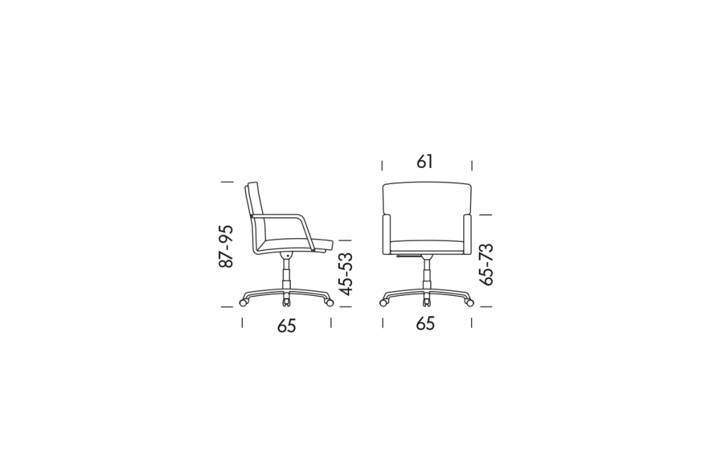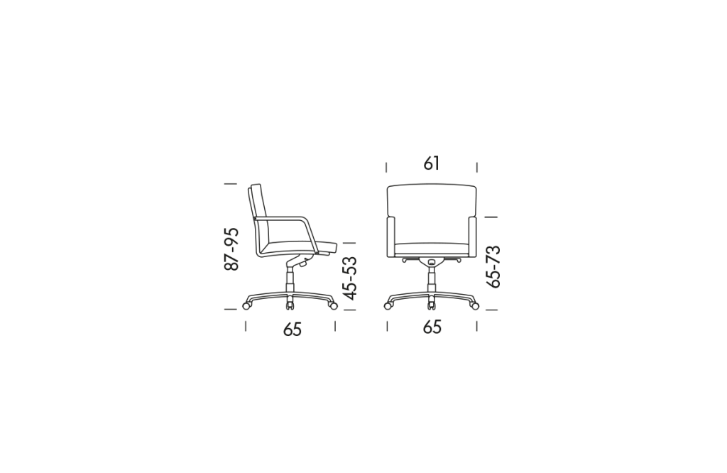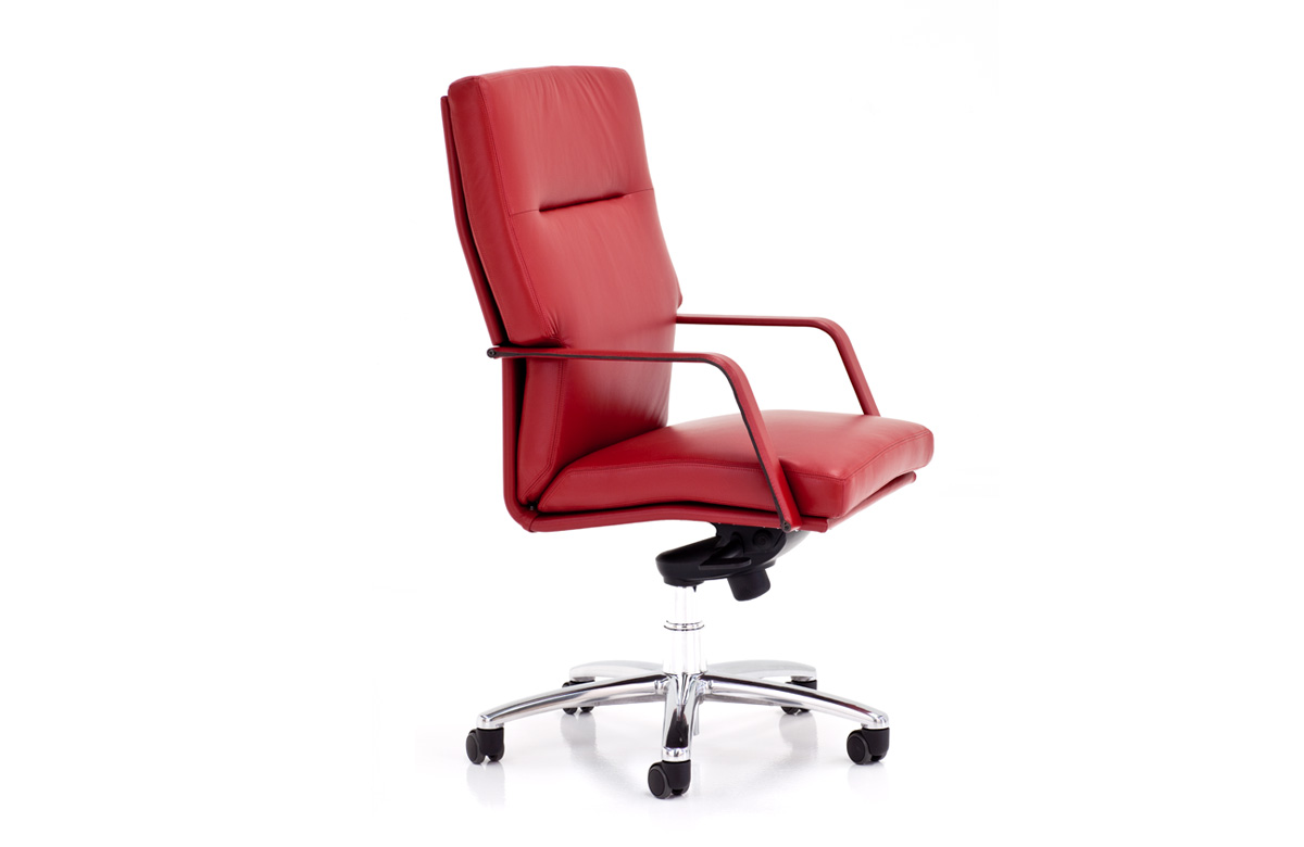 Shell, cushions and armrests covered in soft leather. Fixed base in steel covered in soft leather. Five-star base in shiny or black lacquered aluminium.