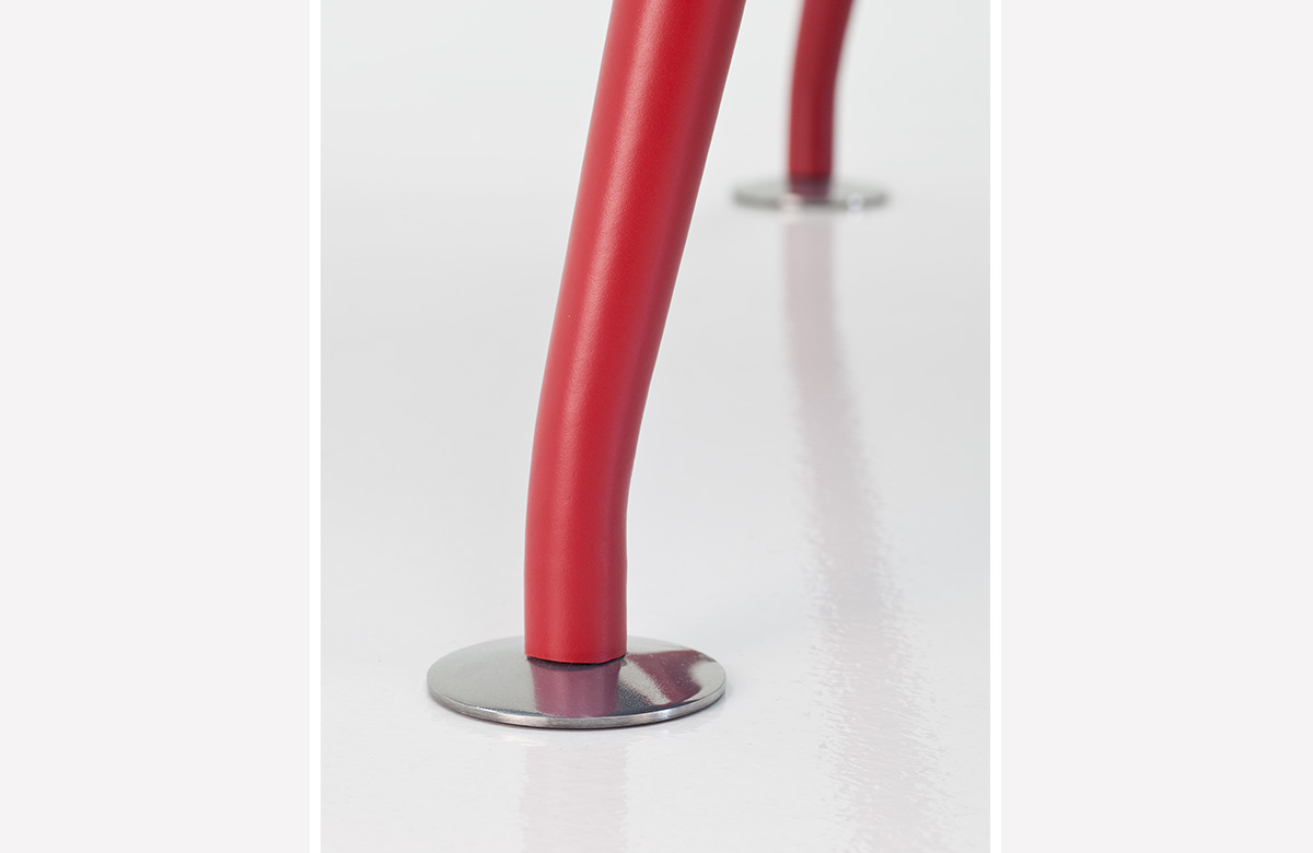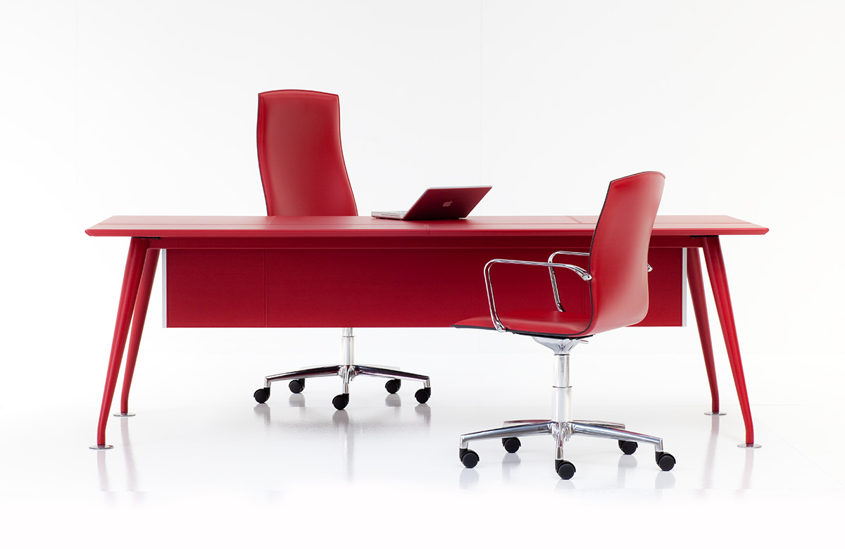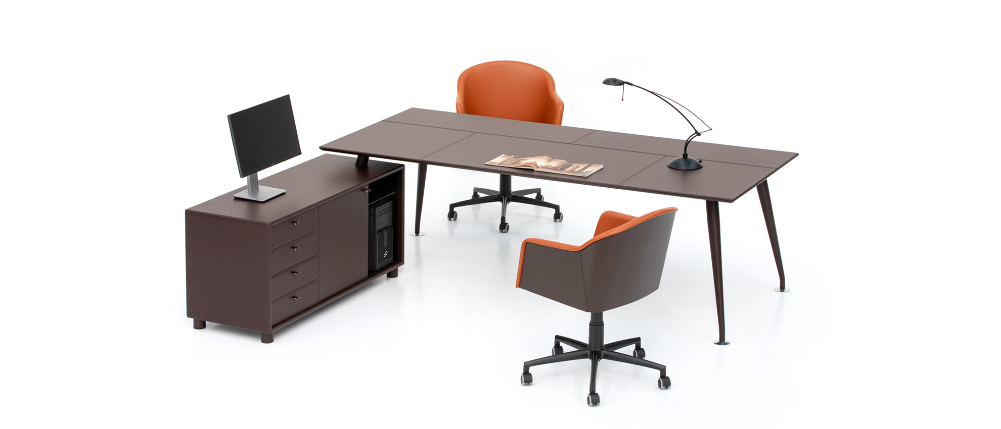 The contemporary design collection includes a range of conference tables and desks with tops in leather and bases in leather or satin-finish chromed steel. The metal structure under the top is in black lacquer finish or covered in leather.